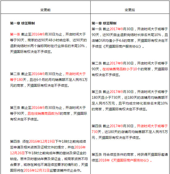 具體來看,天貓國際將對商家不予續(xù)簽的規(guī)則有3個調(diào)整和2個新增的條款: