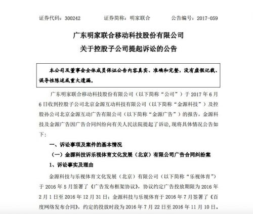 公告披露,金源科技分別訴樂視體育、樂視控股、樂視電子商務(wù)、樂視網(wǎng)四家公司拖欠廣告款,截至2017年3月5日,樂視體育尚欠金源科技廣告款18,517,400元;樂視控股尚欠金源科技廣告款20,036,195.28元;樂視電子商務(wù)尚欠金源科技廣告款10,548,651.60元;上述3起訴訟目前已被北京朝陽法院受理。
