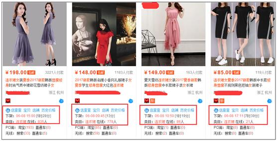 為了不占用太多的篇幅,所以我就截取了第二行的四個(gè)寶貝,看到了么,紅框里面的內(nèi)容(這里安裝一個(gè)插件就可以了,我用的是店查查,沒有做廣告之嫌,別誤會(huì),我只是用的很方便,你也可以用別的),這四款寶貝的剩余下架時(shí)間都在半小時(shí)之內(nèi)。我是沒有截圖,截圖了你會(huì)發(fā)現(xiàn)第一頁基本都是這種情況。