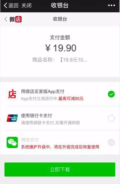 易亞電商嘗試在微店下單,只能選擇使用銀行卡支付或者去微店APP支付,而微信支付已是灰色選項,提示“系統(tǒng)升級維護中,將在升級完成后恢復(fù)使用”。