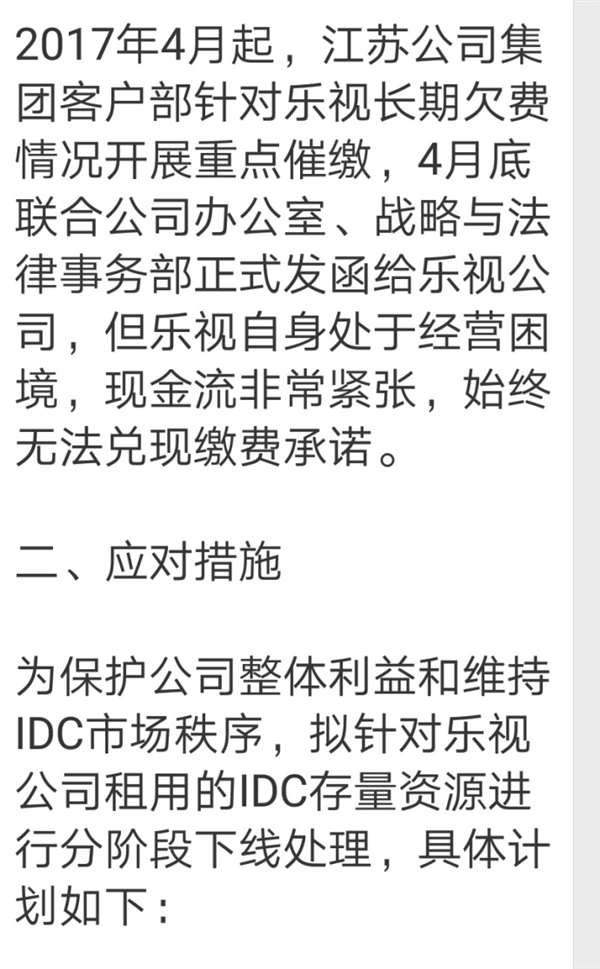 文件顯示,樂視是集團(tuán)政企公司規(guī)定的TOP55重點(diǎn)互聯(lián)網(wǎng)客戶之一,目前在江蘇公司南京、蘇州、無錫三個地市合計租用30個機(jī)柜和290G帶寬,自2016年7月起持續(xù)拖欠IDC資源租用費(fèi),截至2017年5月,全省合計欠費(fèi)總額達(dá)1426.25萬元,已嚴(yán)重?fù)p害公司利益。