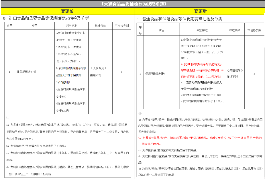 天貓致力于為消費(fèi)者提供更新鮮的商品,故對(duì)于在天貓銷售的商品會(huì)增加關(guān)于保質(zhì)期的要求,本次主要針對(duì)產(chǎn)地為中國(guó)大陸的普通食品剩余保質(zhì)期要求進(jìn)行了升級(jí)。