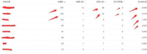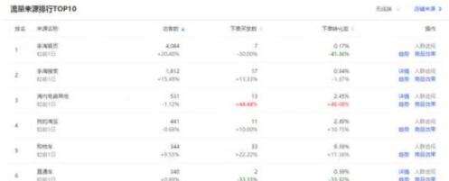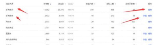 可以看到主要的的流量來源是首頁流量和搜索流量,其中首頁流量的加購率較低,所以我們后面想要得到更多的首頁流量就要通過活動(dòng)來增加首頁的加購率,從而引入更多的首頁流量,或者用直通車定向來精準(zhǔn)首頁的流量也是可以的。搜索流量整體數(shù)據(jù)反饋還是可以的,證明我們引流方向是沒有問題的,但是搜索流量較少所以我們應(yīng)當(dāng)增加搜索流量的引入,點(diǎn)擊詳情就可以查看具體哪些關(guān)鍵詞帶來的流量,可以讓我們?nèi)メ槍?duì)這些關(guān)鍵詞用直通車引流。