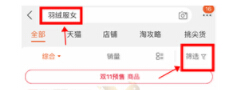 ① 直接在手機(jī)淘寶搜索框輸入產(chǎn)品稱呼,點(diǎn)擊頁(yè)面的篩選按鈕