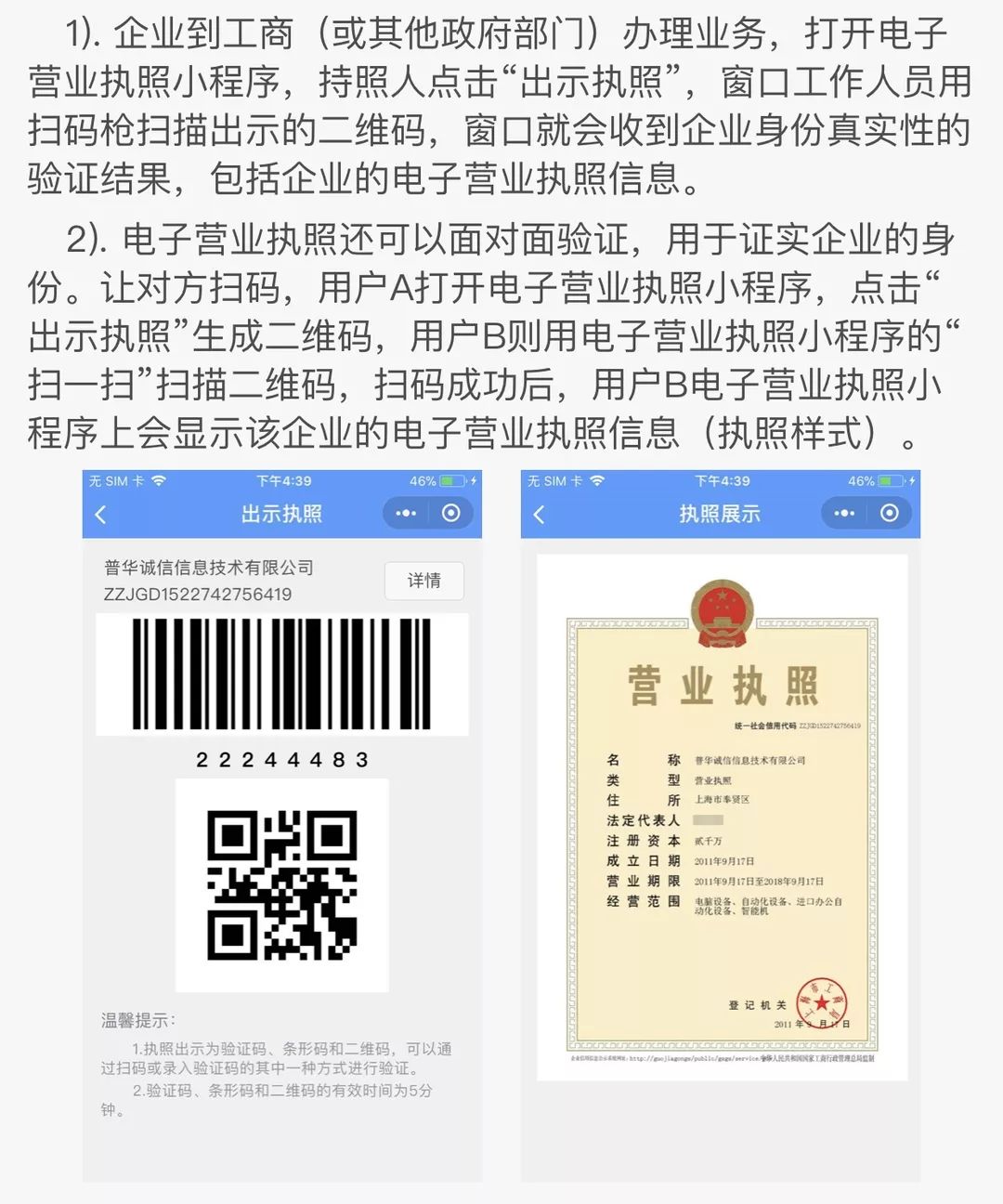 通過電子營(yíng)業(yè)執(zhí)照小程序,企業(yè)可以實(shí)現(xiàn)電子營(yíng)業(yè)執(zhí)照的出示,電子營(yíng)業(yè)執(zhí)照真?zhèn)涡则?yàn)證等功能。