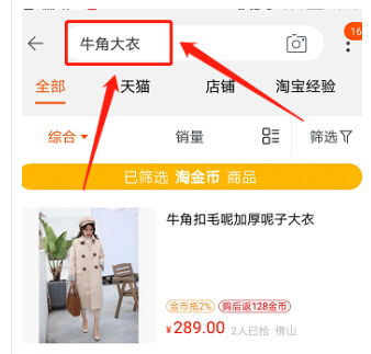 (1)首先,直接在淘寶首頁(yè)搜索關(guān)鍵詞。這里注意,淘寶首頁(yè)搜索框搜,而不是淘金幣搜索框,注意區(qū)別點(diǎn)。