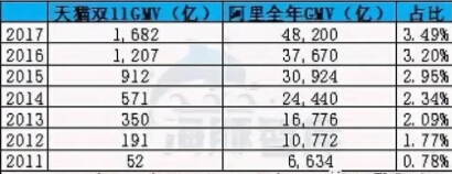 從交易額來看,阿里對雙11的依賴越發(fā)明顯。2017年,雙11交易額為1682億元,占阿里整個2018財年(截至到2018年3月底)GMV的3.49%,高于前一年的3.20%。其實在過去幾年,雙11貢獻的交易額比重一直在上漲。