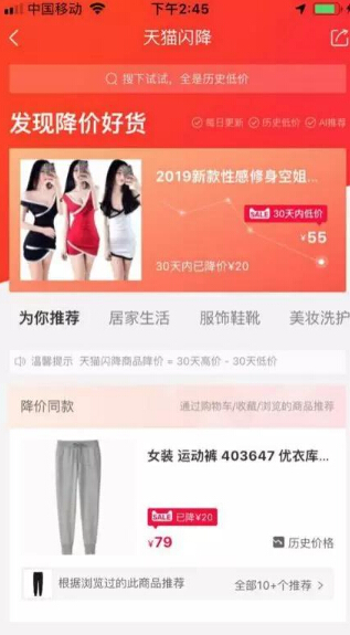易亞電商了解到,在APP天貓首頁,往下拉即就能看到“天貓閃降”入口。APP里的特價好貨頻道,每日更新,AI推薦,在天貓閃降里搜一搜,全是歷史低價商品。