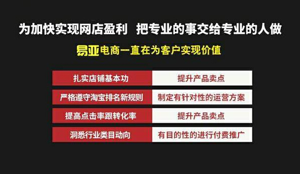 中小賣家想要找淘寶代運(yùn)營(yíng)公司,可以選擇易亞電商,成立九年時(shí)間,一直在淘寶代運(yùn)營(yíng)行業(yè)深耕和研究,用技術(shù)和服務(wù)征服每一位客戶的心。200人專業(yè)團(tuán)隊(duì),掛牌企業(yè),品質(zhì)有保障,能夠更好的幫助商家運(yùn)營(yíng)店鋪。