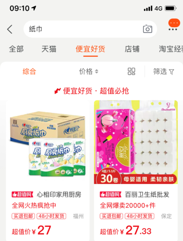 據(jù)悉,從今天起,消費(fèi)者在淘寶APP首頁(yè)搜索任一商品,如“紙巾”,即可在主搜第三欄看到名為“便宜好貨”的特賣區(qū),這是淘寶全面發(fā)力下沉市場(chǎng)的最新動(dòng)作。