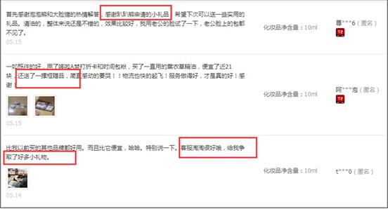 你幾乎可以在阿芙店鋪里面80%以上的評(píng)論里面看到這樣的描述:送了很多小贈(zèng)品、有好多小禮品、非常感謝客服妹妹申請(qǐng)了那么多的小贈(zèng)品……