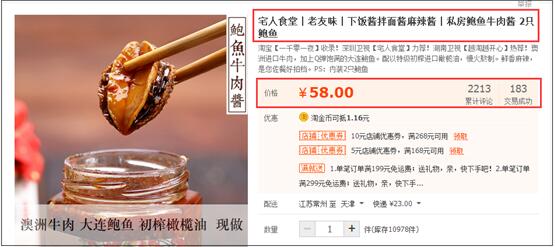 然后你在看第二張圖:誰(shuí)說(shuō)牛肉醬就只能有牛肉了?來(lái),我再給你加上一個(gè)高端的食材:鮑魚(yú)。每瓶牛肉醬里面有兩個(gè)鮑魚(yú),那大家知道兩個(gè)鮑魚(yú)的成本是多少錢么?大家可以自己去1688上看看。兩只鮑魚(yú)的成本不可能超過(guò)20塊錢,但是這個(gè)商品已經(jīng)可以賣到將近60塊錢了,針對(duì)原來(lái)的10幾塊錢,溢價(jià)的幅度很高吧。