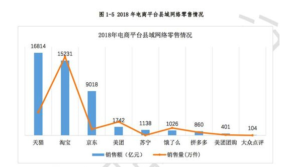 縣域電商交易額上,天貓平臺(tái)縣域電商交易額為16814億元,占比36.29%。淘寶以15231億元、占比32.87%位居次席。兩者總和占比接近70%。
