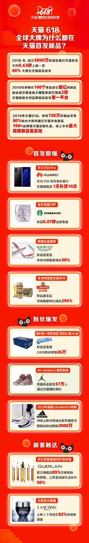 據(jù)介紹,今年4月,天貓宣布2019年將首發(fā)超5000萬款新品,并將手機淘寶首頁天貓入口升級為“天貓新品”。“此外,80%的品牌都將在今年天貓618發(fā)布新品。