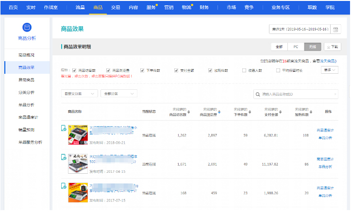 生意參謀的商品效果里面可以看到單款產品每天的各項數據像訪客數收藏加購數如下圖主要看無線端從這些數據可以看到目前店鋪主要是哪幾款在引流量流量進來后產生的收藏加購轉化數據情況如果每天訪客數達到200以上的可以從這里來看主要看流量集中在哪幾款的產品上主要看搜索流量訪客數。
