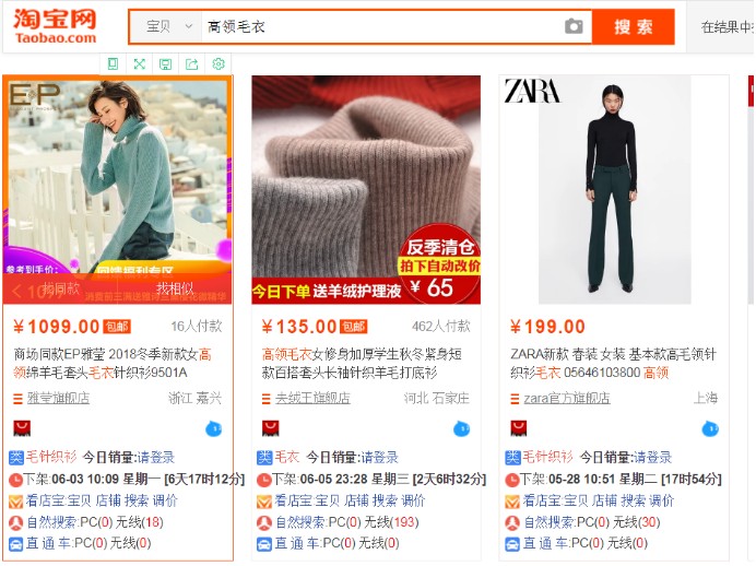 很明顯,是中間一張,因?yàn)橄M(fèi)者搜索的是【高領(lǐng)毛衣】,他希望看到的是一條高領(lǐng)的毛衣,雖然以上三個(gè)產(chǎn)品標(biāo)題都有【高領(lǐng)】,但是只有中間的主圖展示了高領(lǐng),其他兩張只是簡單的展示產(chǎn)品的款式,很明顯不符合消費(fèi)者第一需求。