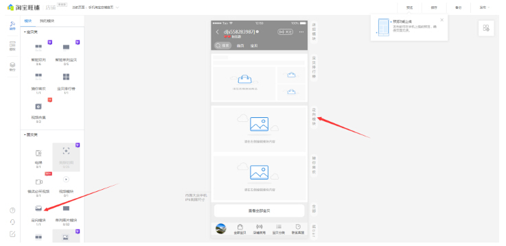 選擇首頁點擊,進入頁面編輯內(nèi)容,將圖文類,定向模塊,拖至店鋪首頁醒目位置,最后保存發(fā)布。