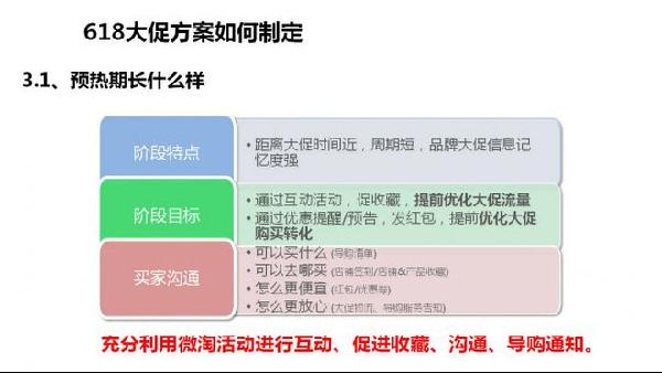 首先,我們要有預(yù)熱方案,正常的預(yù)熱方案包含了營(yíng)造大促氛圍、提前優(yōu)化轉(zhuǎn)化、積累收藏/購(gòu)物車/優(yōu)惠券,推廣節(jié)奏安排。同時(shí),要有大促方案,例如營(yíng)造搶購(gòu)氛圍、刺激購(gòu)買轉(zhuǎn)化、提升客單價(jià)、為后續(xù)持續(xù)銷售鋪墊,最后我們一定要有產(chǎn)品的規(guī)劃。例如主副推款選擇、上新接受的安排、價(jià)格體系擬定、產(chǎn)品存貨盤點(diǎn)等。尤其是,我們要利用無(wú)線端的即時(shí)性效應(yīng),在PC端預(yù)熱之前,我們可以在無(wú)線端提前2~3天進(jìn)行預(yù)熱。因?yàn)闊o(wú)線端的訪問(wèn)更加隨時(shí)隨地,獲得的效果更加好。而且,我們要思考在無(wú)線端做一些營(yíng)造搶購(gòu)氣氛、刺激購(gòu)買轉(zhuǎn)化的活動(dòng),這樣的效果會(huì)更加好。