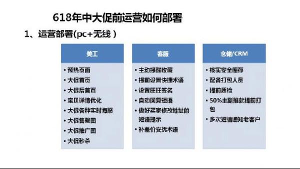 結(jié)合前面的各個(gè)時(shí)期的營(yíng)銷玩法,落實(shí)到各個(gè)崗位分工,包括的維度有:具體時(shí)間節(jié)點(diǎn)、具體的人員需要執(zhí)行的具體內(nèi)容。例如美工要做預(yù)熱頁(yè)面、大促首頁(yè)、大促后首頁(yè)、寶貝詳情頁(yè)優(yōu)化、大促各種試試海報(bào)、大促售罄圖、大促推廣圖、大促秒殺等; 客服方面就要做好主動(dòng)提醒收藏、提前設(shè)置快捷術(shù)語(yǔ)、設(shè)置旺旺簽名、自動(dòng)回復(fù)短語(yǔ)、補(bǔ)差價(jià)安撫術(shù)語(yǔ)等等; 倉(cāng)儲(chǔ)方面需要核實(shí)安全庫(kù)存、配備打包人員、提前質(zhì)檢、50%的主副推款提前打包、多次短信通知老客戶等;