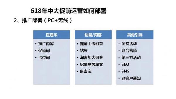 不過(guò),在今年的營(yíng)銷陣營(yíng)上,我們要增加無(wú)線端的玩法,也要增加無(wú)線端的目標(biāo)拆解,所以說(shuō),這個(gè)準(zhǔn)備工作是需要PC和無(wú)線一起同步進(jìn)行。如果你想主攻無(wú)線端,那就要更加關(guān)注無(wú)線端的拆解,制定目標(biāo),給無(wú)線端加入更多的流量。