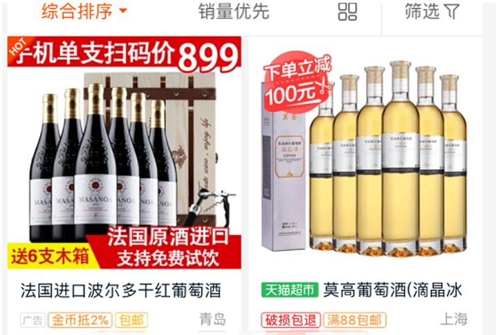 體現(xiàn)掃碼價(jià)的在多少,配合贈(zèng)送的服務(wù)以及紅酒品質(zhì)的保證原瓶進(jìn)口,在滿滿的搜索結(jié)果頁面就起到了聚焦的效果,讓消費(fèi)者好奇從而吸引點(diǎn)擊,這種做法既簡又有效果。