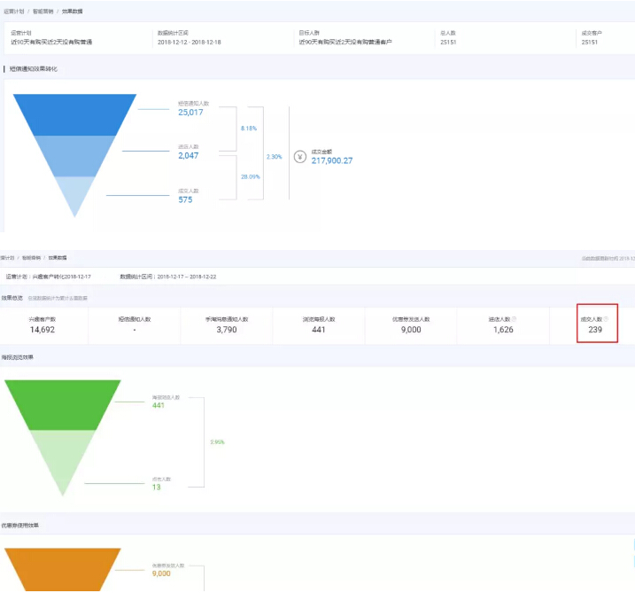我們可以看到,這是雙12大促期間的老客戶數(shù)據(jù),第一張圖是短信營銷其中一部分客戶的數(shù)據(jù);第二張圖是平時給興趣客戶發(fā)優(yōu)惠券的成交數(shù)量。短信4分一條,優(yōu)惠券和海報設(shè)置免費。只要我們做好用戶分層和話術(shù)處理就可以幾乎不花錢或者用很少的錢贏得更多轉(zhuǎn)化和免費訂單。