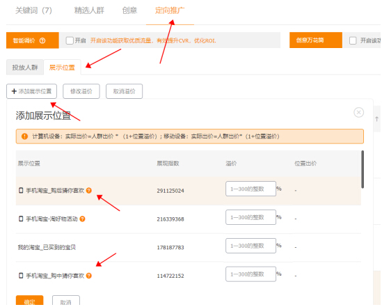 打開(kāi)直通車(chē)---要入池猜你喜歡的寶貝---定向推廣---展示位置---添加展示位置。前面我們講過(guò)猜你喜歡的資源位;涵蓋首頁(yè),購(gòu)中,購(gòu)后資源位。因此如需要對(duì)購(gòu)中,購(gòu)后獨(dú)立設(shè)置溢價(jià),這樣我們才能在不同的展示位置拿到最好的流量。