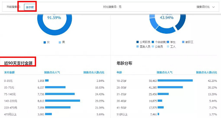 第二:選擇的產(chǎn)品價(jià)格帶要一致,因?yàn)閮r(jià)格帶不同,人群就不同,那么當(dāng)你一旦跨了價(jià)格帶,就意味著你的店鋪的人群就會(huì)有偏差,那么店鋪接下去就會(huì)又回到死店的狀態(tài),所有一般我們是用搜索洞察去定價(jià)(之前的搜索人群畫像)
