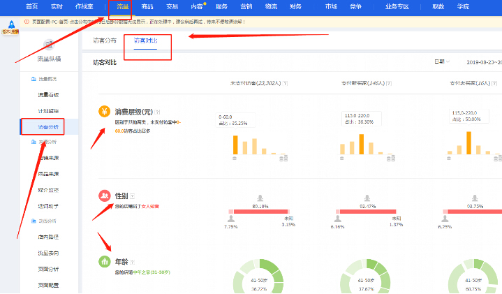 我們?cè)谏鈪⒅\、流量、訪客分析、訪客對(duì)比里,在這里我們可以查看到店鋪的人群標(biāo)簽,在店鋪運(yùn)營(yíng)后期,活動(dòng)推廣的時(shí)候,我們也會(huì)針對(duì)性向這類人群推廣,提高轉(zhuǎn)化率。