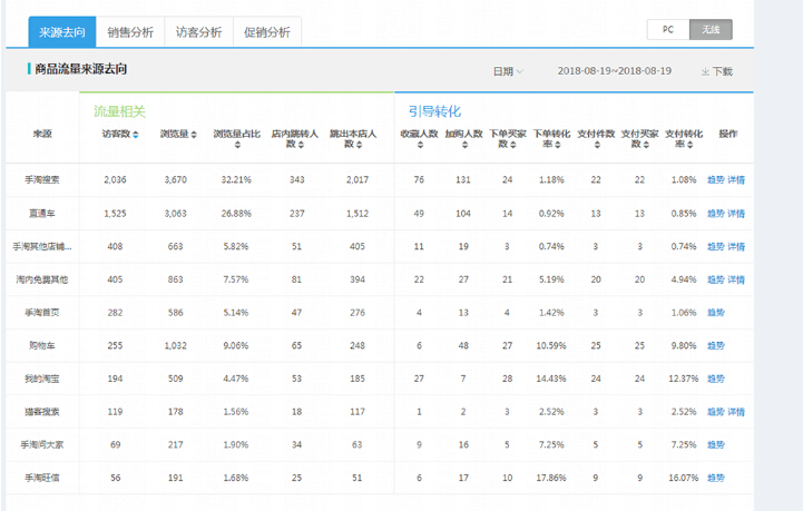 第三步:找到單品,開始點(diǎn)擊單品分析,分析單品數(shù)據(jù)維度,是搜索流量掉了,還是直通車,還是首頁,還是免費(fèi)其他等等。