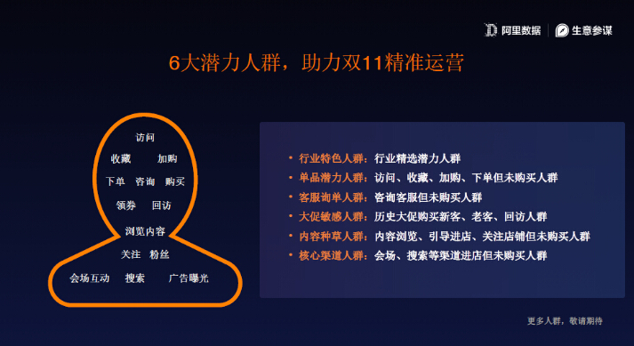 第四個(gè)功能是數(shù)據(jù)回流,現(xiàn)在能提供最長(zhǎng)30天的轉(zhuǎn)化效果,來(lái)告訴你這個(gè)人群到底怎么樣,接著我們一個(gè)一個(gè)來(lái)看大家比較關(guān)心的問(wèn)題,人群管理說(shuō)的到底是哪些人群。