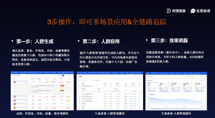 不知道像天貓代運(yùn)營(yíng)說(shuō)的,大家有沒(méi)有發(fā)現(xiàn),生意參謀后臺(tái)的右上角多了一個(gè)板塊,叫做人群管理,這是生意參謀聯(lián)合數(shù)據(jù)銀行,為我們商家推出的消費(fèi)者運(yùn)營(yíng)工具,可以圍繞店鋪的單品、大促、內(nèi)容、服務(wù)等維度,一鍵圈選潛力人群,并通過(guò)廣告、鉆展、短信、優(yōu)惠券、店鋪千人千面的方式,進(jìn)行精準(zhǔn)營(yíng)銷以及洞察和追蹤。