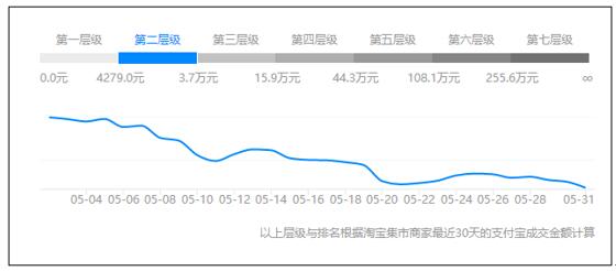 打開你的“生意參謀”,在首頁的右側(cè)邊欄,你就可以看到你的店鋪層級。其中淘寶是按照金額來劃分層級的,天貓是按照比例劃分層級的。統(tǒng)計的標(biāo)準(zhǔn)都是:最近30天的支付寶成交金額,只不過淘寶跟淘寶比,天貓跟天貓比。所以,你的店鋪層級排名跟DSR評分一樣,是動態(tài)變化的。