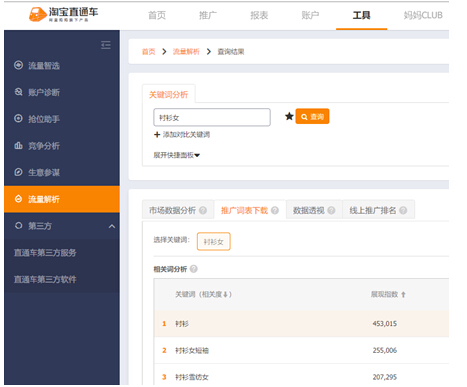 2、借助生意參謀-市場-搜索分析,計(jì)算關(guān)鍵詞的競爭力。如果我們店鋪是集市店,那么可以簡單的將數(shù)據(jù)的不同維度定義為正向指標(biāo)和負(fù)向指標(biāo),正向指標(biāo)相乘作為分子,負(fù)向指標(biāo)相乘作為分母,最終得 到每個(gè)關(guān)鍵詞的競爭力;
