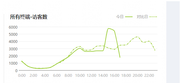 我們可以看到虛線是昨天的數(shù)據(jù)曲線圖,實(shí)線是今天的實(shí)時(shí)曲線圖,我們可以非常直觀地進(jìn)行對比,判斷下一個(gè)時(shí)間段的流量趨勢。