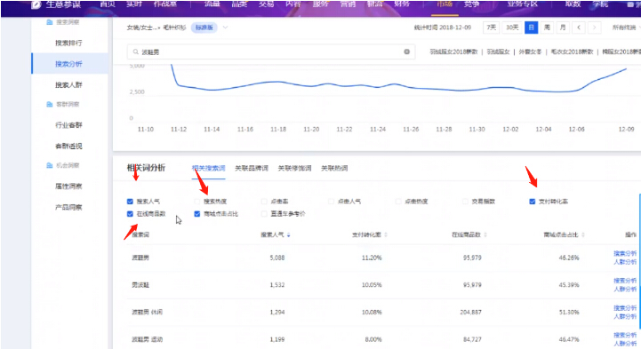首先只打開搜索人氣和在線商品數(shù)的數(shù)據(jù),用在線商品數(shù)除以搜索人氣,而且兩者之間數(shù)據(jù)差距不要過大。一般1:10以內(nèi)我們都可以接受,有些類目競爭太激烈的超出這個(gè)范疇我們也只能接受。其次,如果數(shù)據(jù)優(yōu)質(zhì)則再看商城點(diǎn)擊占比和轉(zhuǎn)化能力是否優(yōu)秀。如果在線搜索人氣低,在線商品數(shù)很少,但是如果搜索人氣程上漲趨勢,雖然轉(zhuǎn)化率不高,那這樣的有可能是我們潛在的神祠。因?yàn)楂@得流量的門檻很低,競爭也很小,這種詞可能會(huì)成長起來,但也可能隨時(shí)就死掉了,但是這樣的詞建議能選就直接選進(jìn)來,我們不知道它什么時(shí)候能爆發(fā),一旦爆發(fā)對我們是很大的機(jī)會(huì),說不定我們的產(chǎn)品就直接做起來了,就算沒有爆發(fā),最了不起我們在優(yōu)化一下標(biāo)題就好了,對我們也沒有什么損失。