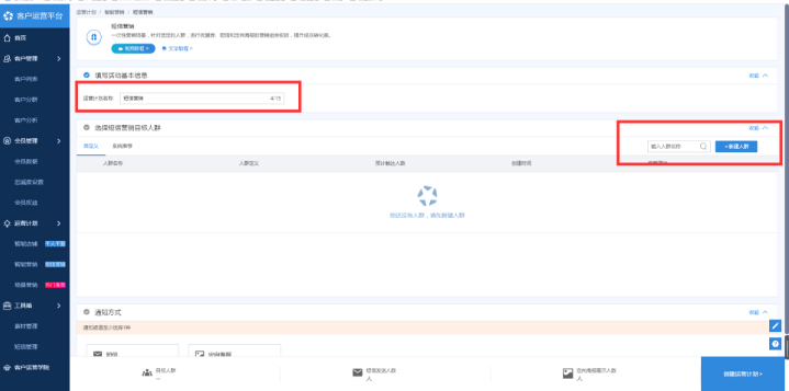 設(shè)置方法:登錄客戶運(yùn)營平臺,進(jìn)入智能營銷標(biāo)簽頁,點(diǎn)擊“短信營銷”功能入口“立即創(chuàng)建”進(jìn)入自定義營銷功能配置頁面;第一步:創(chuàng)建計(jì)劃名稱并選擇人群;在明確我們自己的營銷目的之后,選擇好想要營銷的人群,點(diǎn)擊添加人群,人群保存之后,這個(gè)人群會出現(xiàn)在自定義列表里面,選中確定,便完成了人群創(chuàng)建和選擇的過程;在人群添加好之后,會在編輯頁面看到人群的人數(shù),人群中的所有人都可以進(jìn)行優(yōu)惠券和定向海報(bào)的營銷,人群中有歷史成交的用戶可以進(jìn)行短信營銷;