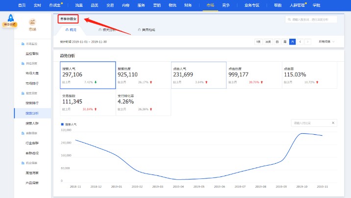 在生意參謀-市場-搜索分析中,我們搜索某個季節(jié)性產(chǎn)品類目詞,可以看到關(guān)于這個關(guān)鍵詞一整年的流量情況。