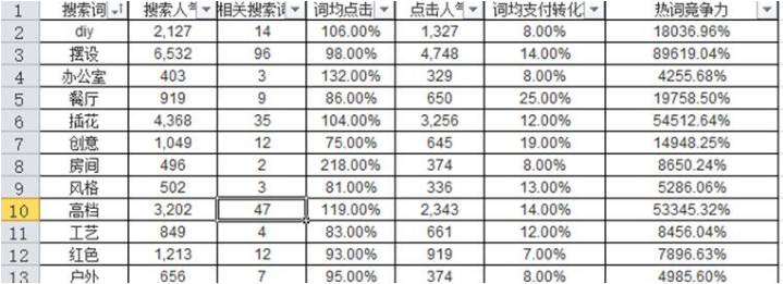 具體操作步驟是,我們打開EXCEL,先計(jì)算一下每個(gè)詞的競爭力(最后一列),計(jì)算公式為:修飾詞競爭力=搜索人氣*詞均點(diǎn)擊率*詞均支付轉(zhuǎn)化率。計(jì)算完后,先按照詞均支付轉(zhuǎn)化率排序一下,先把轉(zhuǎn)化率為零的全部都刪除掉再說。今天和大家分享一個(gè)新品周流量上萬技巧,文章最后有獲取方法,需要的可以重點(diǎn)看一下。接下來在按照搜索人氣進(jìn)行排序,開始從上往下找這種跟你的寶貝精準(zhǔn)匹配的相關(guān)詞,并且不相關(guān)的刪除。一般情況下,我們選100左右的詞,你就開始從上往下挑選就行了,也非常簡單,只要跟你的寶貝是不相關(guān)的或者是弱相關(guān)的,就全部刪除。我下面都是隨便舉例,隨便刪除的。