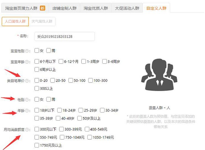 直通車也是給產(chǎn)品打標的一個很好很快速的方法。直通車有兩種途徑可以實現(xiàn)店鋪標簽的形成,第一個途徑是我們經(jīng)常用到的關(guān)鍵詞推廣,前期先加入我們需要的關(guān)鍵詞,然后設置好地域、時間段的投放,然后關(guān)鍵詞的出價不要太高,只是行業(yè)平均或者低于行業(yè)出價也是可行的,這樣做的目的是我們需要通過低出價然后高人群溢價的方法來將產(chǎn)品送到和我們標簽契合的人眼前。這里插一句話,新品期很重要,今天分享一個新品期流量如何過萬的技巧,文章最后有分享,需要的可以重點看一下。如下圖所示的那樣,我們可以通過對客單價、性別、年齡等不同的篩選條件來選擇出適合自己產(chǎn)品的人群,然后通過對不同人群的溢價優(yōu)化來達到產(chǎn)品的加購收藏和成交的增加,然后逐漸形成自己產(chǎn)品的標簽,在選擇人群的時候在保證覆蓋人群數(shù)量足夠的情況下去盡量精細的篩選人群,不能為了人群的競爭而忽略覆蓋人群的數(shù)量,如果人群數(shù)據(jù)太少的話是很難有展現(xiàn)的。