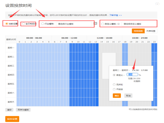 首先可以看到的是當(dāng)前設(shè)置,即目前設(shè)置的分時(shí)折扣情況??梢栽谙朐O(shè)置時(shí)間段按住鼠標(biāo)左鍵拖放,會(huì)彈出在這一個(gè)時(shí)間段理想設(shè)置的折扣,手動(dòng)設(shè)置。 對(duì)于新手掌柜建議選擇行業(yè)模板投放,這個(gè)是按照行業(yè)買(mǎi)家的購(gòu)物特性時(shí)段進(jìn)行投放。 同時(shí)對(duì)于有一定基礎(chǔ)的掌柜,可以自定義模板,分析店鋪實(shí)時(shí)數(shù)據(jù)流量及訂單在哪一個(gè)時(shí)間段相對(duì)是高峰,從而針對(duì)這個(gè)時(shí)間段大力投放,從而提高店鋪流量和訂單。
