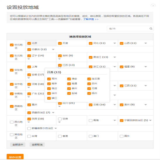除港澳臺(tái)、海外,其他通投;對(duì)于偏遠(yuǎn)地區(qū)可以根據(jù)個(gè)人情況選擇性投放,快遞無(wú)法到達(dá),可不投; 部分行業(yè)可針對(duì)產(chǎn)品特性,所銷(xiāo)售的寶貝是當(dāng)?shù)氐奶厣刹煌斗?,如福建的鞋業(yè),溫州的皮具等; 季節(jié)、氣候產(chǎn)品,針對(duì)性的投放地域,如冬季的棉服,可針對(duì)北方較冷的氣候投放會(huì)更精準(zhǔn)需求。