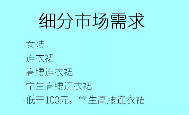 服裝市場非常大,首先進(jìn)行切分,鎖定連衣裙這個市場。但其實連衣裙還是非常大,我們可以再次進(jìn)行切分,比如款式細(xì)分:高腰連衣裙??钍郊?xì)分完了之后還可以繼續(xù)年齡段細(xì)分,