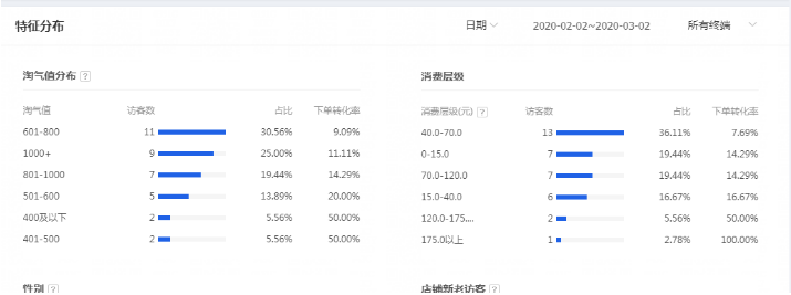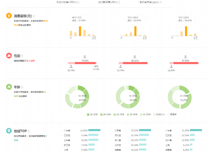 如上圖所示:這個(gè)店鋪的主要進(jìn)店人群的消費(fèi)層級以40-70元的人群居多。那么這個(gè)店鋪的主推款產(chǎn)品是在40-70元之間的客單價(jià),那么這個(gè)人群就是精準(zhǔn)的,反之,假設(shè)產(chǎn)品客單價(jià)在120元那么這個(gè)店鋪的人群就會(huì)很不精準(zhǔn),從而導(dǎo)致店鋪進(jìn)店人群的轉(zhuǎn)化率會(huì)很低。所以看這里就可以基本判斷出你店鋪的人群是否足夠精準(zhǔn)。