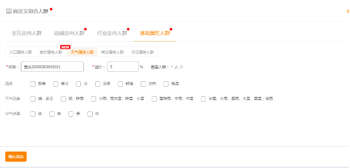 如上圖所示,你可以自行去選擇你的寶貝要投放在哪一類的人群中間,其中的維度有類目筆單價(jià)、性別、年齡、月均消費(fèi)額度根據(jù)你店鋪的流量訪客分析里面的數(shù)據(jù)去自行選擇你店鋪?zhàn)罹珳?zhǔn)的人群。后面還有包括身份屬性人群,天氣屬性人群,淘寶節(jié)日屬性人群,還有節(jié)日屬性人群,都可以根據(jù)你自身的特性去進(jìn)行選擇,比如你是賣吃的,你就不考慮天氣屬性了,但是假如你是賣空氣凈化器的,你在空氣很好的城市那銷量肯定就會(huì)很慘淡,你是賣羽絨服的,你選擇炎熱高溫天氣,那肯定就是和自己的錢包過不去了。前面的寶貝定向人群,店鋪定向人群同樣以店鋪寶貝數(shù)據(jù)為基礎(chǔ)去選擇合適的人群,假如不確定這個(gè)人群對自己店鋪有沒有用,就先溢價(jià)20%,觀察2-3天看看效果,成本不會(huì)很高。