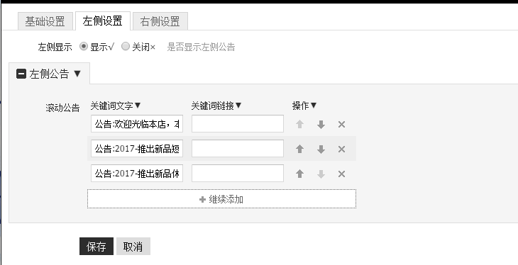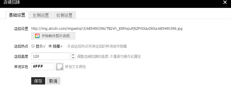 我們要注意店招高度不應(yīng)太大大概110左右。店招的左側(cè)設(shè)置可設(shè)置公告滾屏和超鏈接,右側(cè)設(shè)置可設(shè)置圖片廣告與超鏈接,并且可以添加客服旺旺。
