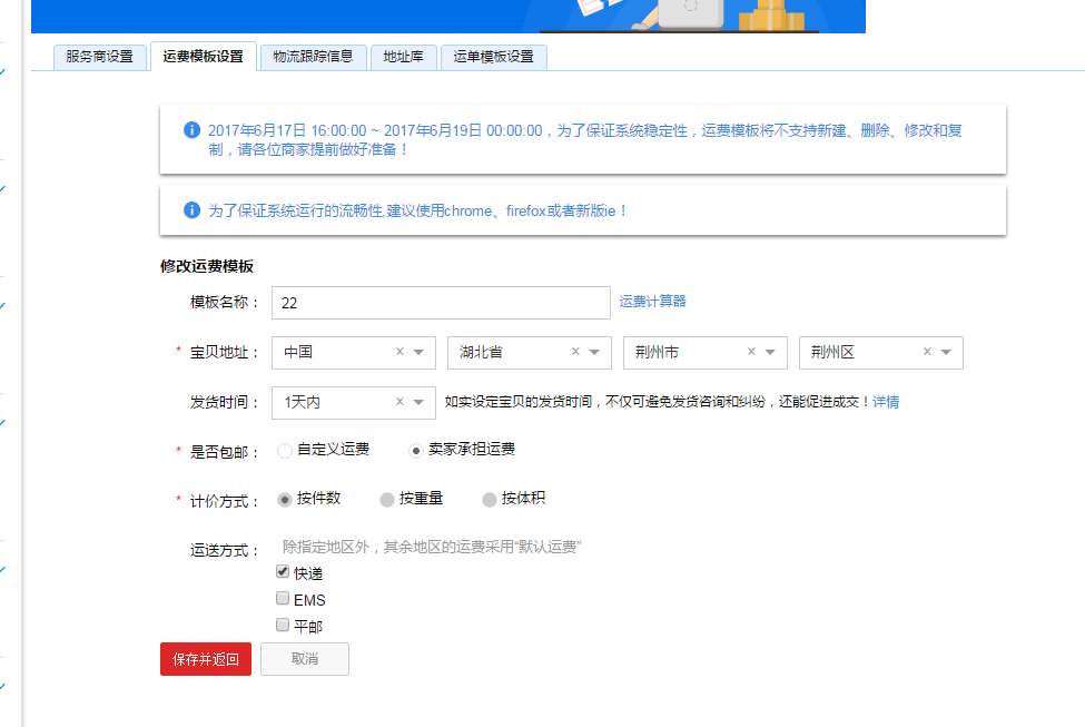 我們可使用我們的物流模板,或者自己設(shè)置是否包郵,包郵哪些省份,幾件包郵,按件還是按斤包郵,等等