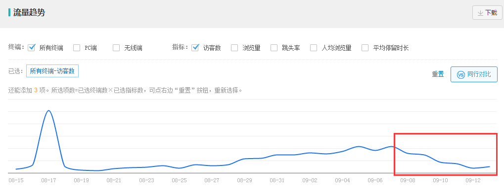 首先看整個店鋪整體的流量概況,看是哪一天的流量出現(xiàn)下滑:
