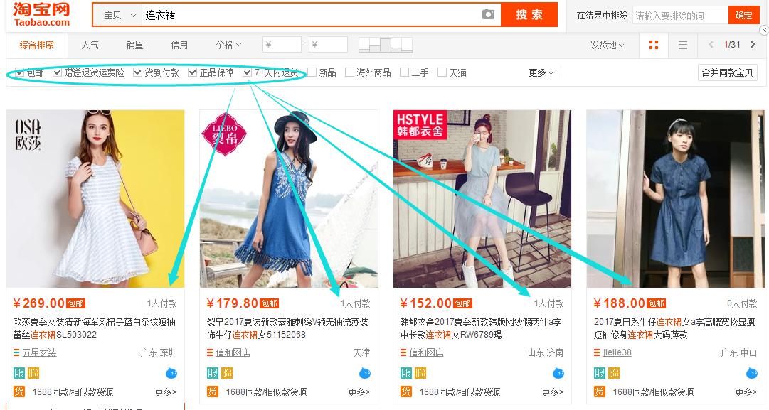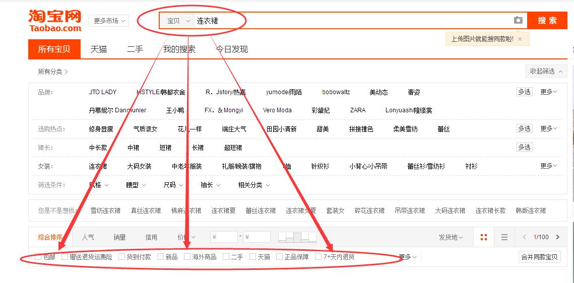 比如說(shuō)我們搜索連衣裙的時(shí)候就可以發(fā)現(xiàn)產(chǎn)品的標(biāo)簽,我們可以看到這產(chǎn)品標(biāo)簽中包含“包郵、增送退貨運(yùn)費(fèi)險(xiǎn)、貨到付款、新品、海外商品、二手、天貓、正品保障、7+天內(nèi)退貨” 這就是產(chǎn)品的標(biāo)簽。