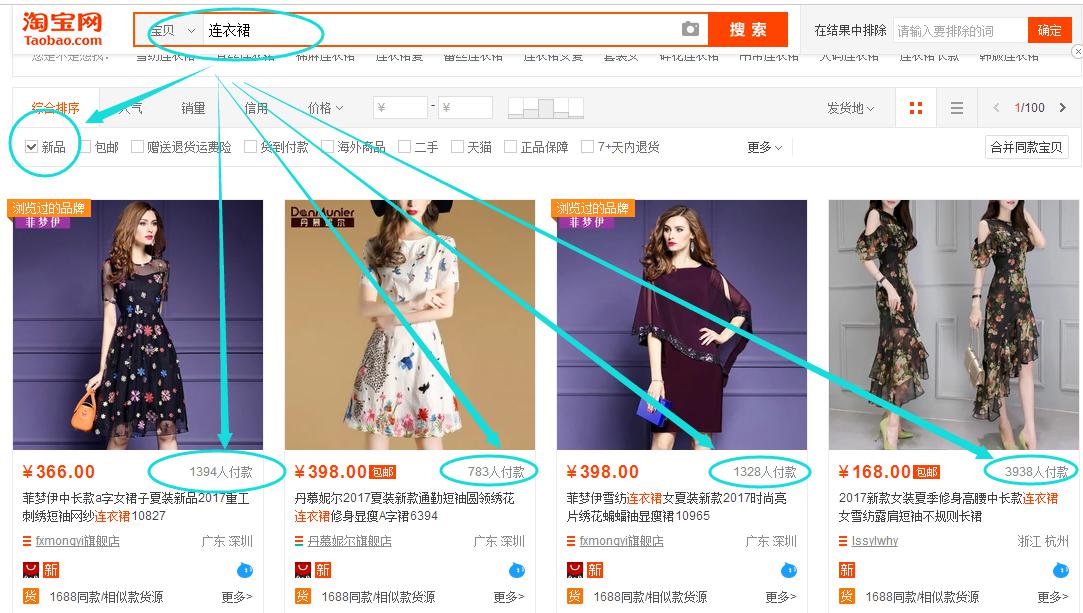 通過(guò)關(guān)鍵詞做出來(lái)的結(jié)果我們可以看到產(chǎn)品的付款人數(shù),我們可以看到通過(guò)連衣裙搜索出來(lái)的首頁(yè)展現(xiàn)出來(lái)的產(chǎn)品付款人數(shù)都是要過(guò)萬(wàn),說(shuō)明想要通過(guò)這個(gè)關(guān)鍵詞獲得展現(xiàn),產(chǎn)品自身的基礎(chǔ)要十分的強(qiáng)。